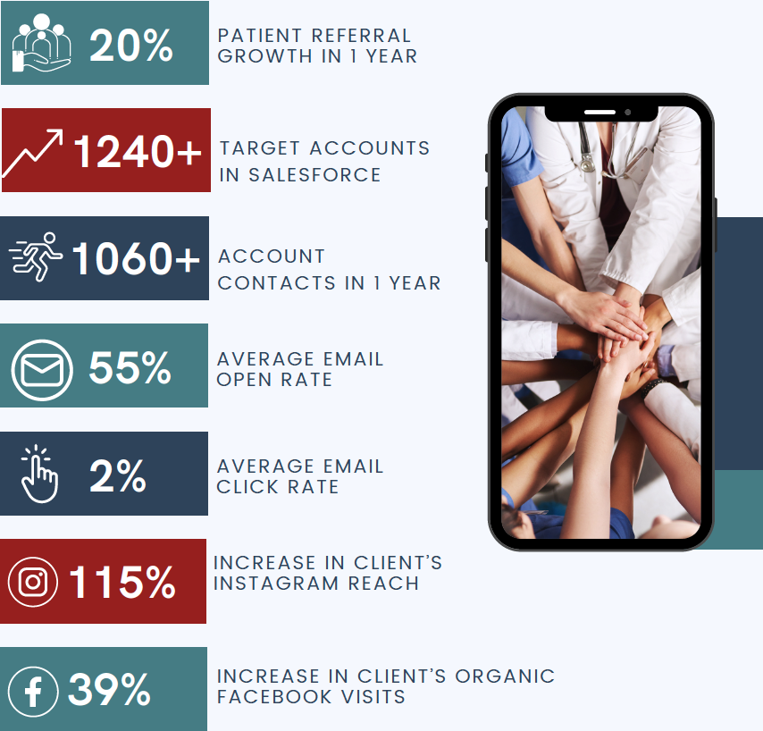 The practice was able to remain open throughout the year and not only retained staff but doubled the number of employees on the team. Identified 30 prospective referral source and have grown that list to 150 active accounts. Averaged 10 to 15 calls per week to include introducing the practice, sending digital collateral, identifying practice influencers and scheduling meet and greet with providers. Collaborated with marketing firm to design business cards and rack cards, enhance website content and optimize social media. Took over management of social media and organically grew the Facebook page from approximately 100 followers to over 300 in 3 months with a minimum of 5 posts per week. Analysis of referral data showed that over 40% of patient volume was attributable to the physician referral strategy and practices contacted.