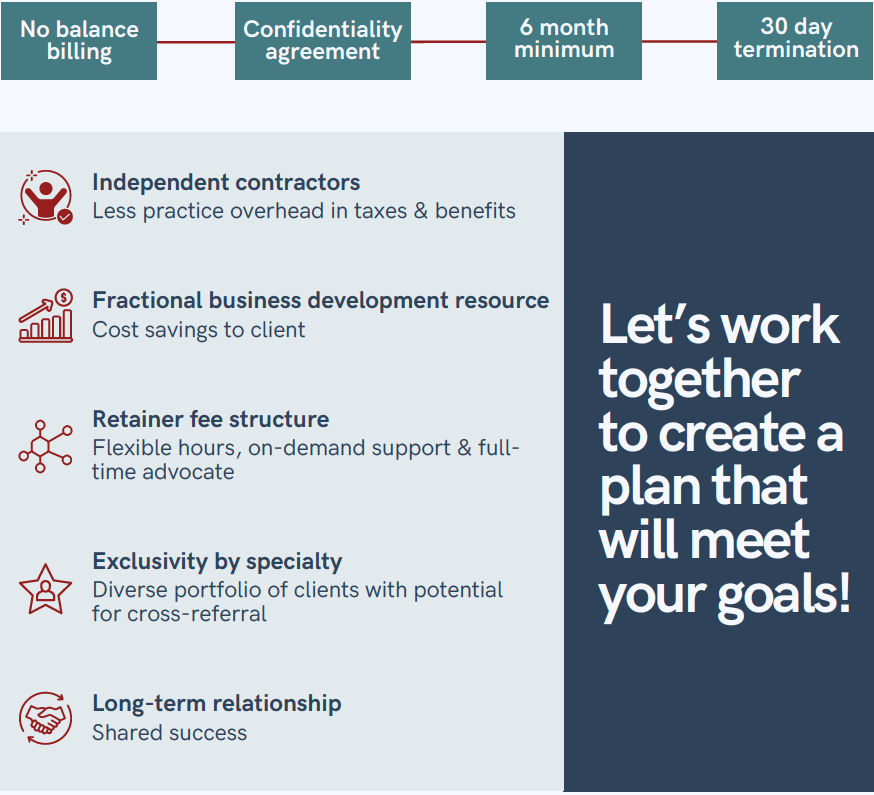 Our goal is to establish a mutually beneficial relationship that affords you a savings of time, money and resources, while optimizing your business model and increasing your patient volume. Experienced consultants customize a marketing and development strategy, identify growth goals, evaluate tactics to achieve those goals and create a timeline for execution.